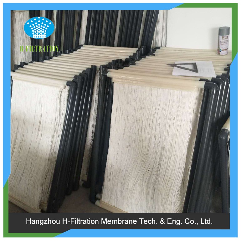 系統運行時,采用恒定流量辦法,抽吸負壓可通過電接點式壓力表讀取,初始膜片操作負壓在-0.01 ~ -0.03Mpa。當條件許可時,出水可采用虹吸方式,但生化池液位與出水水池液位差應在3.0-4.0米以上,則膜片的更不易污染,出水更穩定,使用周期更長。當操作負壓超過-0.06MPa時,需對膜片及時進行化學清洗。清洗方法是將膜堆置于化學清洗池或者膜組件片從膜架上取下,用清水對膜片表面進行沖洗,除去膜片表面附著的活性污泥,再用0.5%NaClO溶液浸泡1小時,殺死附著在膜表面的細菌,然后用5%的NaOH溶液將膜片浸泡2小時,除去附著在膜片表面的有機物和膠體物質,再用清水對膜片進行沖洗,膜片通量即可恢復。若水中的鹽類物質較多容易在膜表面結垢,可先用2~3%的鹽酸浸泡約1小時。清洗工作應十分小心,嚴防損壞膜絲。